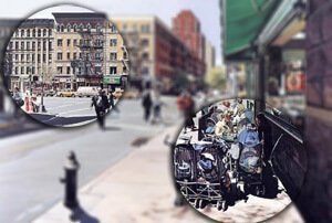 Aquí con retoque de Photoshop te exagero el efecto… mira como detalla el autor más a ese personaje que cruza la calle y los coches que tiene a ambos lados… el resto… sin apenas detalle. ¡Ahí es donde el autor quiso centrar tu atención cuando vieses su obra!