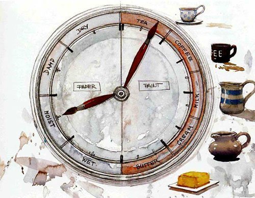 Considero muy interesante para hablar de este tema, tomar como referencia y punto de partida, lo mejorcito que hay publicado al respecto para mi gusto, EL RELOJ DE LA ACUARELA al que hace alusión Joseph Zbukvic en su libro “MASTERING ATMOSPHERE & MOOD IN WATERCOLOR” (2002).