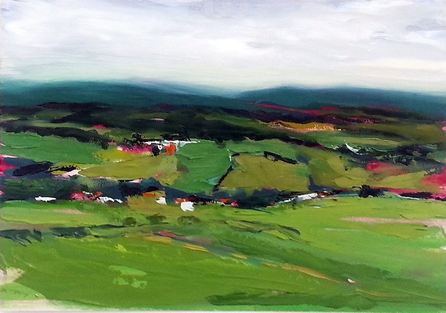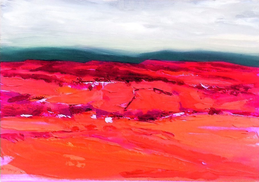 Parece una contradicción pintar los verde justo encima de su complementario pero créeme que haciéndolo así verás perfectamente todos los matices que de los verdes obtengas con distintas mezclas en tu paleta. Además, si dejas que se entrevea algo de esa primera mancha en carmín le darás un toque muy artístico y distinto a las zonas en verde de tus cuadros.