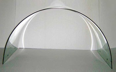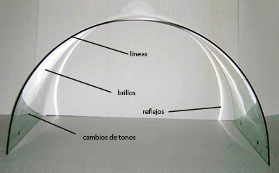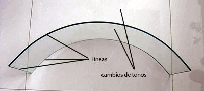 En esta imagen reconocemos perfectamente un cristal curvo puesto de canto en el suelo. Pero fíjate bien qué es lo que vemos realmente de él. A lo más vemos unas líneas que delimitan su contorno y unos cambios sutiles de color con respecto al color mismo del suelo.