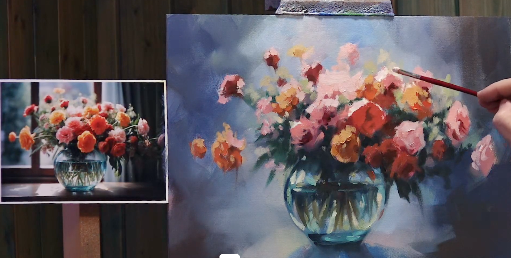 Tutorial completo de pintura al óleo en el que aprenderás a construir un bodegón floral paso a paso, comprendiendo cómo organizar la luz, el color y las masas desde las primeras pinceladas.